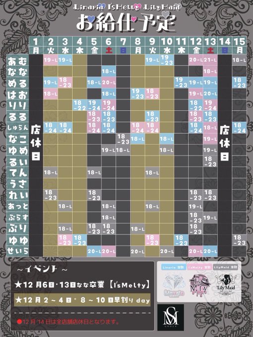 固定⚜️Lily Maid (リリィメイド)⚜️|神戸三宮メイド・コンカフェ@Lily_Maid·Linaria × I'sMelty × LilyMaid 12月前半のカレンダーです⚜️ みなさまのご来店お待ちしております☕️ #神戸コンカフェ #コンカフェ #三ノ宮コンカフェ 遠隔サイトはコチラ↓↓↓↓ http://msgroup.official.ec2348
