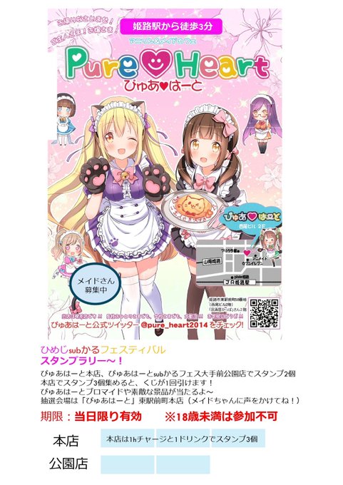 兵庫・神戸・三宮 メイドカフェ ぴゅあはーと姫路 メイドカフェ❤️ぴゅあはーと@pure_heart2014·いよいよ本日開催! #ひめじsubかる フェス ぴゅあはーとのステージ出演は 12時20分~ 見に来てね〜!! 出張メイドカフェもご帰宅お待ちしてます♡ 大手前ぴゅあブース⇄ぴゅあ駅前本店 スタンプラリーも開催★2201,064