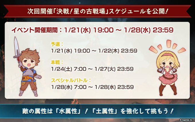 兵庫・神戸・三宮 アニソンバーすてら地和@🌟アニソンカフェすてら🌟さんがリポスト正方形のプロフィール画像グランブルーファンタジー@granbluefantasy·【グランブルーファンタジー】次回開催の「決戦!星の古戦場」は、1/21(水)~1/28(水)を予定しております!敵の属性は「水属性」です。土属性の編成を鍛えて、開催をお待ちください! #グラブル77851,18610万