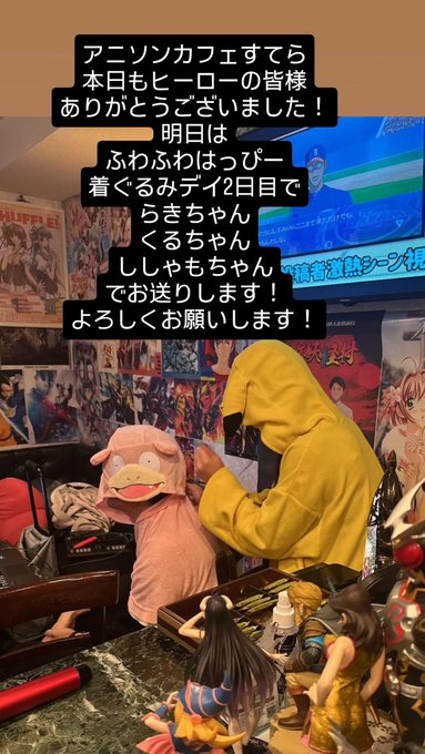 兵庫・神戸・三宮 アニソンバーすてら地和@🌟アニソンカフェすてら🌟さんがリポストアニソンカフェすてら@anisonbarstella·#アニソンカフェすてら! 本日もヒーローの皆様ありがとうございました! 明日ははっぴーもふもふ着ぐるみデイ2日目らきちゃん、くるちゃん、ししゃもちゃんでお送りします! よろしくお願いします! #今日のすてらの出勤ボード #がんばれゴエモン1173