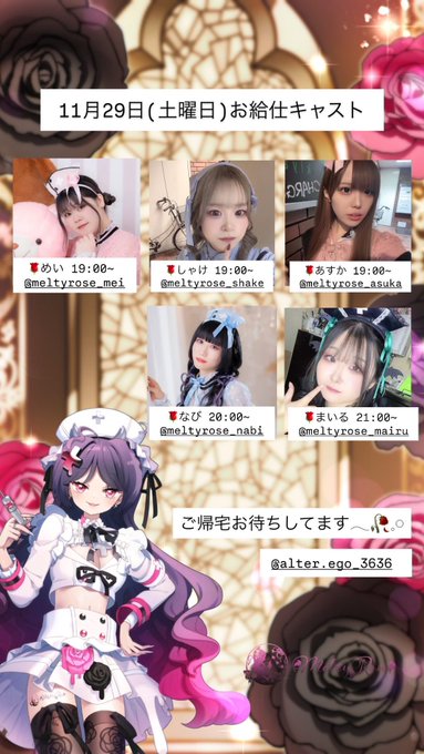 京都 MeltyRose京都コンセプトバーMeltyRose🥀💉@MeltyRose___·11月29日(土曜日)のお給仕です🌹 🌹めい 19:00~ 🌹しゃけ 19:00~ 🌹あすか 19:00~ 🌹なび 20:00~ 🌹まいる 21:00~ ご帰宅お待ちしてます𓂃🥀𓈒𓏸 @AlterEgo_3636 もお給仕いたします21