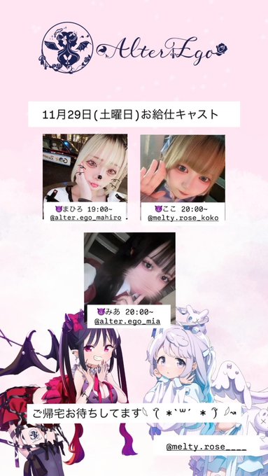 京都 AlterEgo京都コンセプトカフェ&バーAlterEgo👼🏻@AlterEgo_3636·11月29日(土曜日)のお給仕です😈👼 😈まひろ 19:00~ 😈みあ 20:00~ 😈ここ 20:00~ ご帰宅お待ちしてます𓆩 (⃔ *`꒳´ * )⃕ 𓆪↝ @MeltyRose___ もお給仕いたします5