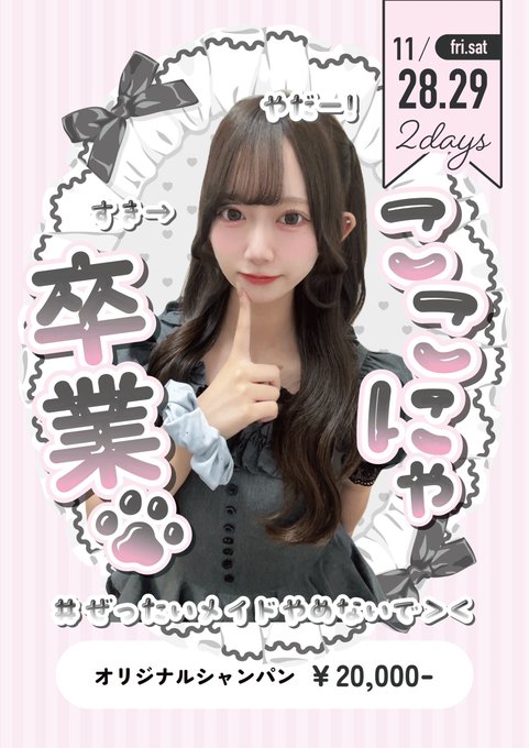 兵庫・神戸・三宮 コンカフェ はにーないとここなさんがリポストまどか@_madochi·11時間ここちゃんが面接にきた日のこと、初めて話したときのこと、今でも鮮明に覚えてる🫶🏼 当時のわたしは目も上手く合わせられないくらいの人見知りで、不器用だったけど、すっっごく嬉しくて、あの日からずっとここちゃんの味方であろうと思ってました。 ここにゃ最後、頑張ってね🥲🩶引用姫路 コンカフェ🎀はにーないと🎀@honeynight2023·13時間🩶本日お給仕のメイド🩶 ゆあ@yuachandesu__ れあ@rea_180_pyon さら@5q2_sara ろっぷ@r0ppu_x ここな@coconyaxx にの@nino_ux7 もか@moca_9014 めい@mei_x_x1122 れいな@_ri7chan えな@enaglcl うる@Uru_ux_ なぎ@yhcccnnn りな@rlna_9zs ここなちゃん卒業イベント🩶🐾 【営業時間】 19:00-1:003312723