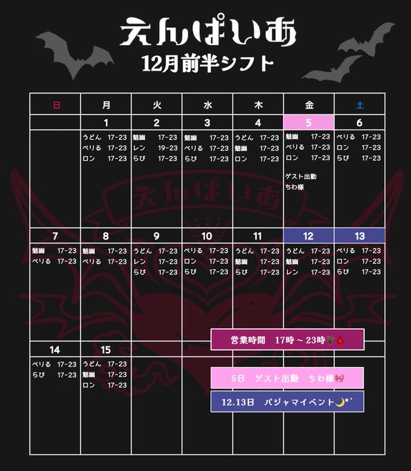 兵庫・神戸・三宮 えんぱいあ神戸シーシャコンカフェえんぱいあ@Empire_kobecafe·【12月前半シフト】 5日 ゲスト出勤 ちわ様 🎀 12.13日 パジャマイベント 🌙*゚ 遠隔🩸 http://empirekobe.base.shop173
