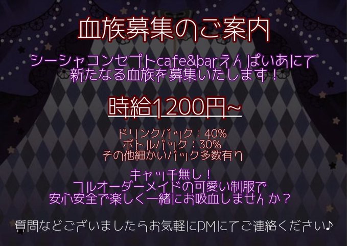 兵庫・神戸・三宮 えんぱいあ神戸シーシャコンカフェえんぱいあ@Empire_kobecafe·【本日の吸血鬼】 17-23時 @chanta_empire @uoxou__rabi_ 営業時間 17-23時 #コンカフェ #シーシャカフェ #神戸 #三宮 遠隔 http://empirekobe.base.shop152