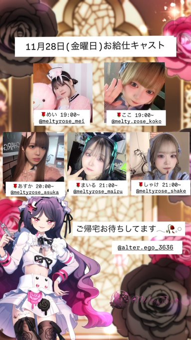 京都 MeltyRose京都コンセプトバーMeltyRose🥀💉@MeltyRose___·11月28日(金曜日)のお給仕です🌹 🌹めい 19:00~ 🌹ここ 19:00~ 🌹あすか 20:00~ 🌹まいる 21:00~ 🌹しゃけ 21:00~ ご帰宅お待ちしてます𓂃🥀𓈒𓏸 @AlterEgo_3636 もお給仕いたします👼😈13