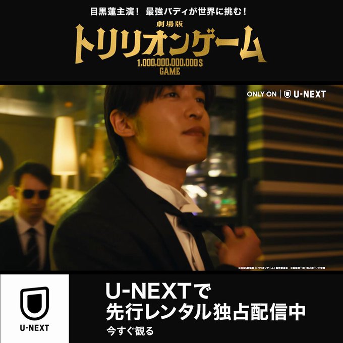 正方形のプロフィール画像U-NEXT@watch_UNEXT正反対の最強バディが世界に挑む🎬 劇場版『トリリオンゲーム』U-NEXTで先行レンタル独占配信中! 出演:目黒蓮 佐野勇斗 今田美桜 福本莉子 / 吉川晃司 世界を覆すハッタリ男×凄腕エンジニア!ターゲットは、“世界一のカジノ王” U-NEXTならドラマもアニメも一緒に楽しめる0:33unext.jpから83883,4041,789万プロモーション