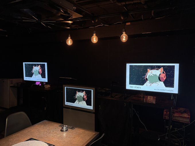 心斎橋・ 宗右衛門 サブカル深夜喫茶 Polar Nightサブカル深夜喫茶 Polar Night🌙☕️さんがリポストJYOTAROU 🎧@pn_JoeP2·ポラナイのDJブース前にモニターつけたよ💻 なんか一気に雰囲気出た イベントの時はVJさんに映像流して貰えるし、ゲームとかも3画面でできるの熱い🐕 #ポラナイ4160