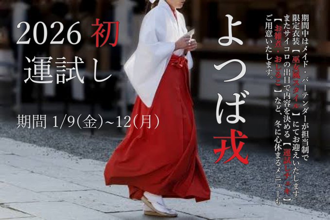 難波・日本橋 よつばの秘密基地大阪なんば日本橋@よつばの秘密基地@yotubabase·#よつばの秘密基地 本日より【⛩️よつば戎⛩️】開催中 🍀屋敷わっこ(-18) ⛩️りこ(-22) ⛩️ゆずき(18-) ⛩️なぎさ(19-) 🍀ロイ(19-) ⛩️⋯巫女風スタイル 【⭐️限定メニューおしながき】 ●お雑煮 ●おしるこ 各800円 ●運試しワイドチェキ 1000円 お待ちしております🍀1118