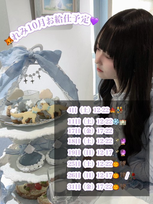 れみ🦊💜@らてめぃど㌠@remi_latte·🦊れみ10月お給仕予定💜 4-5日 紅葉デート(私服)🍁👫 11-12日 雪国学園祭(学生服)❄️🏫 18-19日パワーストーン(通常制服)🪄︎︎🔮 25-31日 四季ハロウィン(オリコス)🎃🦇 26日(日)12-17 メリメロです🥀 ほぼ一年ぶりだから楽しみ꜀^. ̫.^꜆ 来店予約、観光予約はリプ、DMまで🫶🏻117171