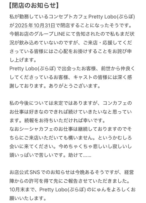 にゅん🪐10月末で店がサ終👈はい❓@Nyun2shisha_plb·29分コンカフェぷらぼ、閉店まで1ヶ月切ってます 後半のシフトは未定ですが、それを合わせても片手で数えられるくらいしか会えないです😞😞😞 後悔したくないし、させたくないから会いに来てほしいです引用にゅん🪐10月末で店がサ終👈はい❓@Nyun2shisha_plb·10月1日【重要なお知らせ】 私が勤務しているコンカフェPretty Labo(ぷらぼ)@Pretty_Labo が今月末で閉店することになりました。 ご心配をお掛けする状況になってしまったことを深くお詫びいたします。 詳細は画像をご覧ください。 ぷらぼのにゅんを最後までよろしくお願いします!1103