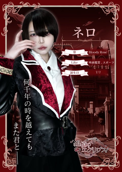 難波・日本橋 追憶のエクリプスロズ🌹@追憶のエクリプス@rose_tsuieku·6時間ネロくん!同じ寮ー!!❤ 初めましての時から元気マシマシで話してるだけで元気貰えます、本当に褒め上手! 声の大きさバトルしよう引用追憶のエクリプス🦇12/15OPEN大阪男装コンカフェ@tsuioku_eclipse·12月11日Vamp紹介 ˚˙༓࿇༓˙˚˙༓࿇༓˙˚˙ 📕Vamp紹介🦇 ˚˙༓࿇༓˙˚˙༓࿇༓˙˚˙ ネロ @nero_tsuieku Bloody Rose 純血主義が集まる 意識が高くリーダー気質 #男装コンカフェ #エクリプス学院14247