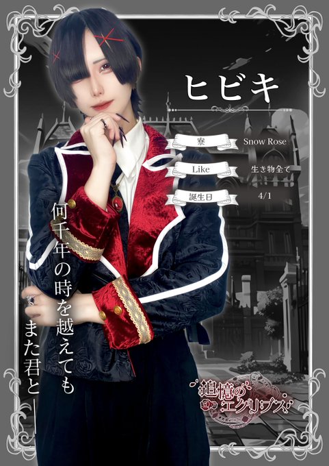 難波・日本橋 追憶のエクリプスロズ🌹@追憶のエクリプス@rose_tsuieku·6時間ヒビキくん!! 穏やかの権化、ワタワタしている僕にも優しくしてくれました……メイクも小物もセンスの塊です 15cmぐらい身長差があるので身長高すぎてお顔見る度に首がもげます引用追憶のエクリプス🦇12/15OPEN大阪男装コンカフェ@tsuioku_eclipse·12月11日Vamp紹介 ˚˙༓࿇༓˙˚˙༓࿇༓˙˚˙ 📕Vamp紹介🦇 ˚˙༓࿇༓˙˚˙༓࿇༓˙˚˙ ヒビキ @hibiki_tsuieku Snow Rose 限られた高貴な血筋 平和主義で優しい #男装コンカフェ #エクリプス学院14221