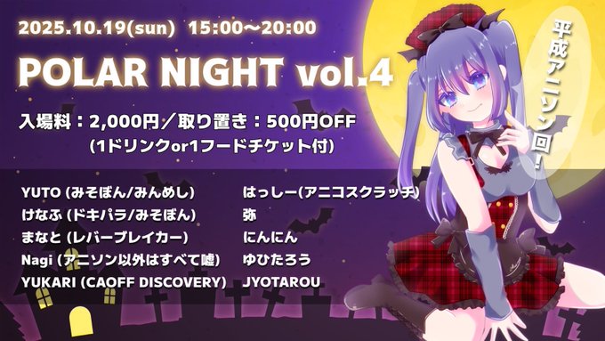 サブカル深夜喫茶 Polar Night🌙☕️@Polarnight1219·5時間DJイベントは専用アカウントあります♪ こちらのアカウントも要チェック❗️ #ポラナイDJ引用POLAR NIGHT 次回 10/19@POLARNIGHT_1219·9月18日/ 🎃POLAR NIGHT vol.4🎃 \ 10.19(日) 15:00〜 定期開催のDJイベント🎶💿 今回のテーマは「平成アニソン回」 あの頃はよかったな〜、が口癖のキミは要チェケラ🫵🏻 ポラナイのイベントは「ドリンクorフード」が チケットと引き換えできます!✨👨🏻🍳 楽しく飲んで食べて遊んじゃおう🌟 #ポラナイDJ169