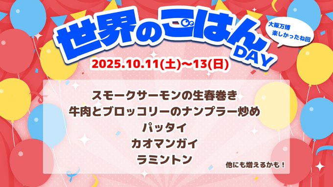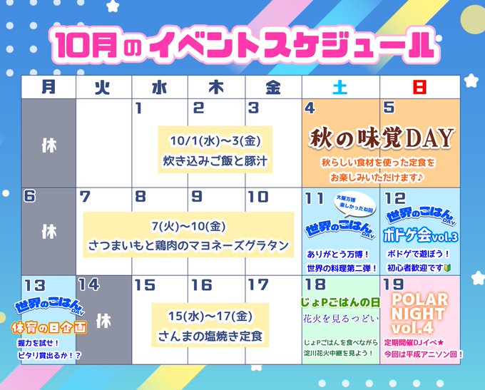 サブカル深夜喫茶 Polar Night🌙☕️@Polarnight1219·5時間/ 🌏世界のごはんDAY🌏 〜万博楽しかったね回〜 \ 万博開幕後、勝手に応援企画で企画したこちら❗️ ありがとうを込めてvol.2を開催します❗️🎉 今回はアジア圏にフィーチャーしつつ…な メニューラインナップ🍵 閉幕日現地に参加✨の方も、チケ取れなかった💦方もお待ちしてます🔴🔵 #ポラナイ引用サブカル深夜喫茶 Polar Night🌙☕️@Polarnight1219·10月4日🎃10月前半のイベント予定🍂 4(土)5(日)秋の味覚DAY 7(火)〜10(水)さつまいもと鶏のグラタン 11(土)〜13(月)世界のご飯vol.2 12(日)ボドゲ会vol.3 13(月)体育の日企画 15(水)〜17(金)秋刀魚の塩焼き定食 18(土)じょPごはん&花火を見るつどい 19(日)定期DJイベ 各詳細は別途ポストします💫 #ポラナイ250