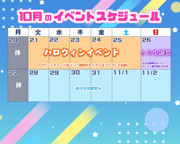 サブカル深夜喫茶 Polar Night🌙☕️@Polarnight1219·🎃10月後半のイベント予定🍂 21(火)〜25(土)ハロウィンイベント 26(日)るな生誕祭 28(火)〜11/2(日)??? 後半はイベント盛りだくさん! 詳細は別途ポストします💫 #ポラナイ90