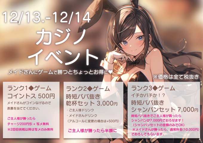 難波・日本橋 メイドカフェりきゅうメイドカフェ🍴りきゅう🤍公式⟡@rikyuu_midcf·本日のお給仕情報🪄◝✩ ♦️本日カジノイベント ♠️ 15時💎 ひなちゃん さとうちゃん 16時💎 りこちゃん 19時💎 あおいちゃん ◌⑅◌⑅◌⑅◌◌⑅◌⑅◌⑅◌ #メイドカフェ #コンカフェ1299