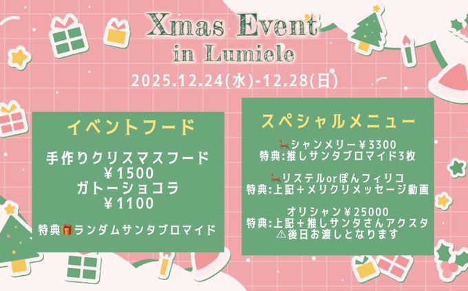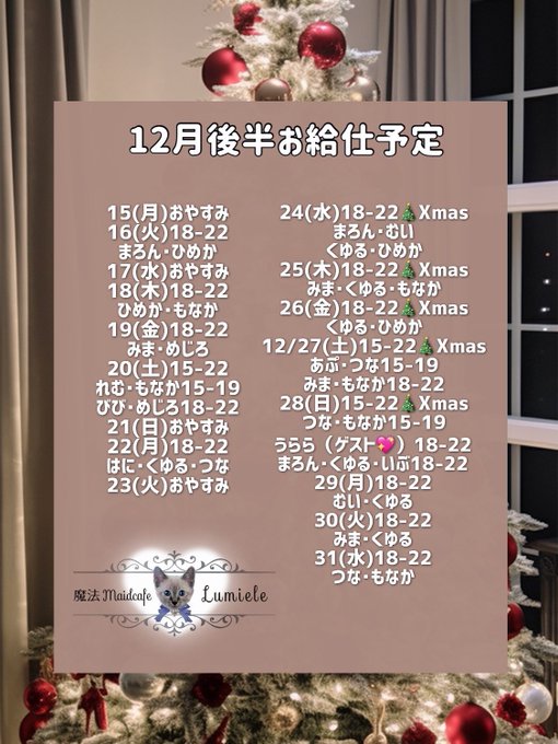 難波・日本橋 子猫maidcafeRagdollまろん🧁𝐋𝐮𝐦𝐢𝐞𝐥𝐞&𝐑𝐚𝐠𝐝𝐨𝐥𝐥@Lum_mrn·15分引用𝐋𝐮𝐦𝐢𝐞𝐥𝐞🪄︎︎魔法メイドカフェルミエル@Lumiele_maid·8時間୨୧┈┈┈┈┈┈┈┈┈୨୧⑅*。 魔法maidcafe Lumiele 12月後半給仕予定表🪄⌒♡ 🦌➰Event➰🦌 12/24(水)~28(日)クリスマスイベント🎄 🌟28(日)18-22時はうららちゃんゲストお給仕❣️ 皆様のご帰宅を心よりお待ちしております🐈⬛54