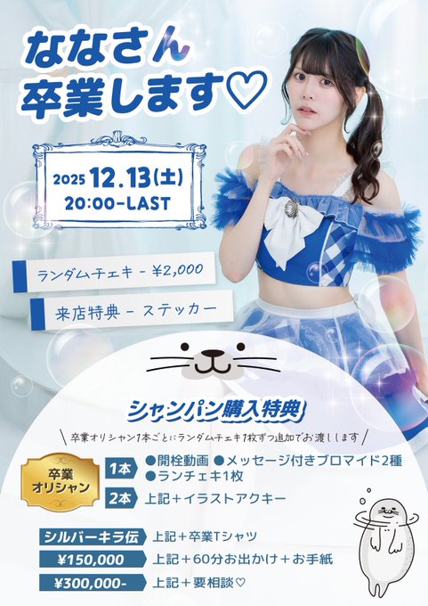 なな🦭12/13卒イベ♡@nana_oshiose·おはようございます! 本日【なな卒業イベント】です🦭🫶🏻💘 20-L 2号店で行わせて頂きます! 出勤して下さるキャストの皆さん、 見送りに来てくれるご主人様お嬢様、 最後まで手伝って下さったスタッフの方々、 本当にありがとうございます:: ( › - ‹ ) ::🤍🍒 最後までよろしくお願いします!!515677,793