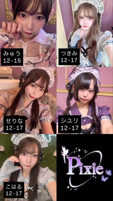 難波・日本橋 MaidCafe Pixie🦋🧚♀️MaidCafe Pixie🧚♀️🦋@maidcafe_pixie·Pixie open🧚♂️✨ 12月13日(土)12:00~23:00 12-15 みゅう@myu_pixie 12-17 つきみ@tukimi_nuts せりな@serina_pixie シユリ@shiyuri_pixie こはる@koharu_pixie 後半組はツリー⬇️ たくさんのご来店お待ちしております💟112177