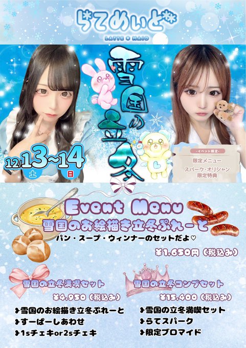 難波・日本橋 雪国のお絵かきメイドカフェらてめぃど雪国のお絵描きメイドカフェ らてめぃど 日本橋オタロード本店@lattemaid_otaro·❄️日本橋メイドカフェ『らてめぃど』Open❄️ ❄️12月13日(土)❄️ 🤍12-17 あいす@ice_latte31 🤍12-22 れみ@remi_latte めろ@mero_latte2 🤍12:30-22 くれあ@kurea_latte 🤍13:30-22 ぷぅ@pwu_latte 🤍17-22 ここ@coco__latte2 ご主人様、お嬢様の ご入国をお待ちしております❄️16434