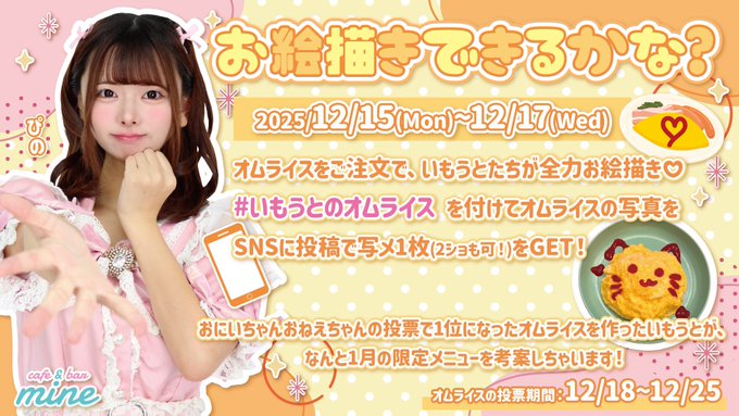 難波・日本橋 まいんまいん🎀いもうとコンカフェ@mine1201_·🎀まいんいべんとにゅーす🎀 【お絵描きできるかな?🍽️❤️】 🍅2015/12/15-12/17🥦🍳 オムライスご注文で妹たちが全力お絵描きしちゃいます❣️さらにSNS投稿でツーショット写メもGET📸✨ ⬇️ オムライスのお絵描きが1番上手ないもうとちゃんは1月の限定メニュー考案権利獲得🌟115