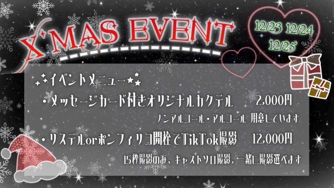 難波・日本橋 cafe &barアンジェールロゼ🥀@Angelle@angelle_rose_·꒦꒷12月後半꒷꒦ 20日-25日 🎄クリスマスイベント🎄 31日 🔢カウントダウンイベント 年末ー.ᐟ .ᐟ それなりにいるからいっぱい来店予定待ってる🎶 #ロゼニャンいる日17176