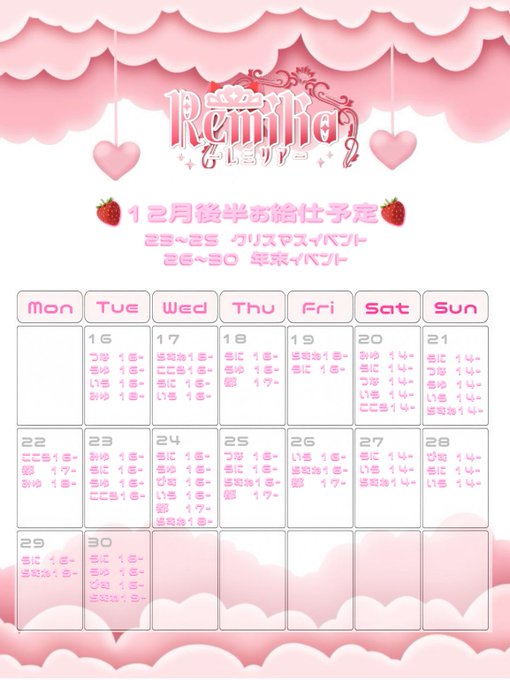 難波・日本橋 Remilia(レミリア)Remilia -レミリア- 大阪コンカフェ@Remilia_1001·🍓12月後半お給仕予定🍓 12/23.24.25 クリスマスイベント🎅♡ 12/26~30 年末イベント☃♡ どちらのイベントもお得な特典が沢山です🫶🏻🎶 ♥️たくさんのご帰宅をお待ちしております🤍1290