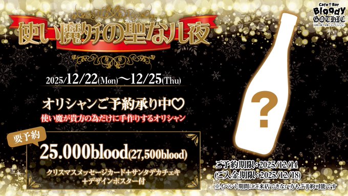 難波・日本橋 クロナイクロナイ┃大阪・日本橋🦇魔界コンカフェ@bloody_gothic_·🌲御案内🌕 クリスマスイベントオリシャンのお知らせ🦌✨ 契約者様タチへの使い魔お手製オリシャンご予約承り中💜🎁 使い魔が貴方の為だけに手作りします😈💖 特典も盛りダクサン👀 予約必須デスのでお見逃しナク🌙 #コンカフェ #クリスマス3114
