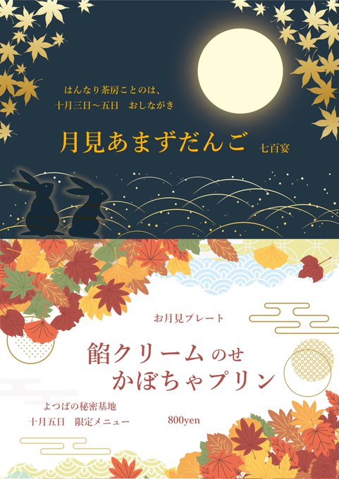 大阪なんば日本橋@よつばの秘密基地@yotubabase·#よつばの秘密基地 オープン致しました🏠🍀 🍀ロイ(-19) 🍀ねむ(-22) 🍀まにゃ 🍀はむっ 🍀ゆずき(16-) 🍀ひょこ(18-) 【🎑10/6はお月見です🎑】 お月見が待ち遠しくなるような メニューをご用意致しました✨ 秋の夜長はぜひ秘密基地で🍀 ご訪問、お待ちしております☕11126