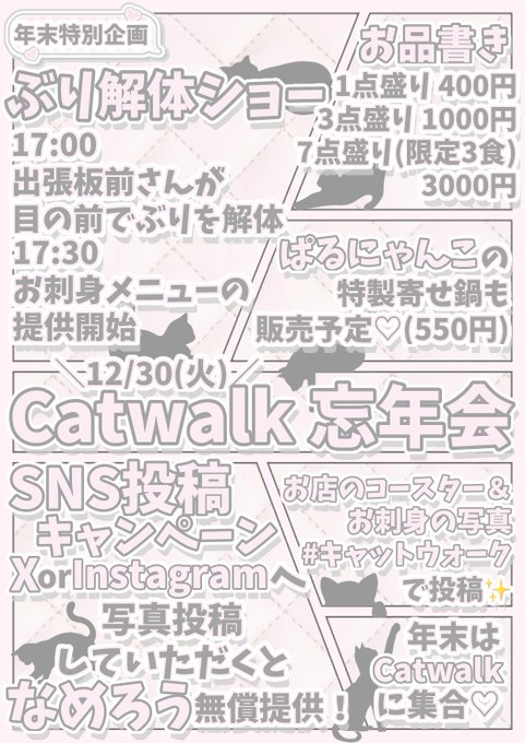 心斎橋・ 宗右衛門 キャットウォーク CatwalkCat walk【キャットウォーク】@Cat_walk91·12/30(火) Catwalk忘年会 【 年末特別企画!】 前代未聞 コンカフェに出張板前