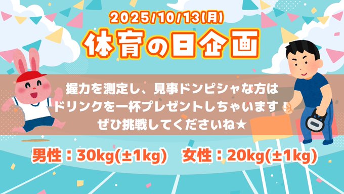 サブカル深夜喫茶 Polar Night🌙☕️@Polarnight1219·7時間/ 🤸♀️体育の日企画🏋 \ 三連休ラスト月曜はおふざけ企画⁉️ 体育の日にちなみ、握力ゲームを開催💥 見事ピタリ賞の方はその場でドリンクを1杯プレゼント🎁 弱すぎても、少し力んでも、 大幅に数値がズレるので意外と難しい…! ぜひ挑戦してみてくださいね🥇 #ポラナイ引用サブカル深夜喫茶 Polar Night🌙☕️@Polarnight1219·7時間🎃10月前半のイベント予定🍂 4(土)5(日)秋の味覚DAY 7(火)〜10(水)さつまいもと鶏のグラタン 11(土)〜13(月)世界のご飯vol.2 12(日)ボドゲ会vol.3 13(月)体育の日企画 15(水)〜17(金)秋刀魚の塩焼き定食 18(土)じょPごはん&花火を見るつどい 19(日)定期DJイベ 各詳細は別途ポストします💫 #ポラナイ2178