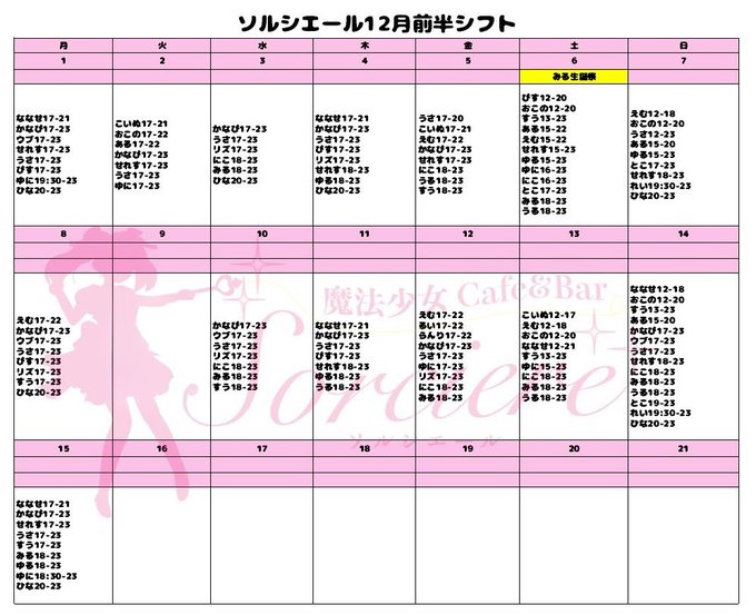 難波・日本橋 ソルシエールソルシエール@魔法少女コンセプトCafe&Bar@sorciere_osk·〜本日(12/14)の魔法少女〜 12- おこのちゃん @_ohkono_ 13:30- すう @sorciere_suu 15- ある @sorciere_aru 17- まぎ🔰 @magi_sorciere かなぴ @sorciere_kanapi うさ @sorciere_usa 18- ウブ @moratorium_ubu せれす @celes_sorciere にこ @nico_sorciere みる @miru_sorciere うる @uruuu_pyon 19-さらに表示4181