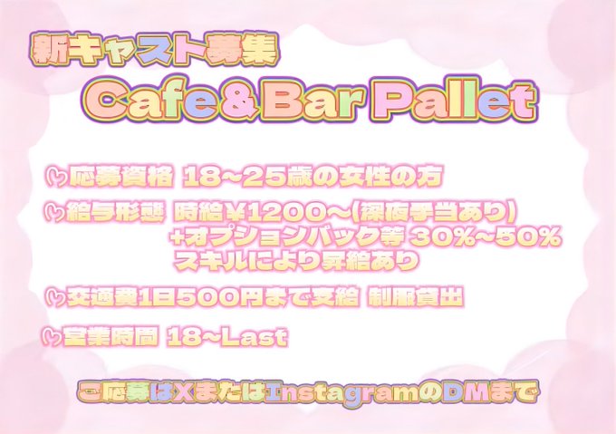 Pallet🏰【パレット】@pallet_bar7·✨出勤キャスト✨ あくた 18-23 @littlegangstar7 スア 20-L @Hananlzuthukl めるる 20-L @meruru_hawahawa しお 20-0 @sio_pallet 🔶遠隔はプロフィール欄からできます🥂 🔶キャストさん随時募集中👩🏼✉️ #コンカフェ求人 #ミナミ #大阪 #宗右衛門町2105