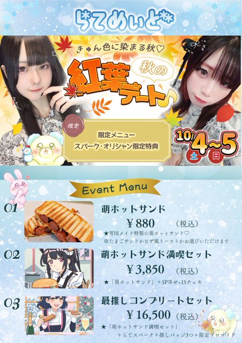雪国のお絵描きメイドカフェ らてめぃど 日本橋オタロード本店@lattemaid_otaro·❄️日本橋メイドカフェ10/4(土)『らてめぃど』Open❄️ 🍁10/4・5日は紅葉デート💕 12-22 れみ🦊 @remi_latte ミミ🐼 @mimi_latte07 めろ💖 @mero_latte2 にいな🧸 @nina_lattemaid 17-22 かんな⚙ @kamna_merimero ご主人様、お嬢様のご帰宅をお待ち致しております❄️ #オタロード #コンカフェ2111689