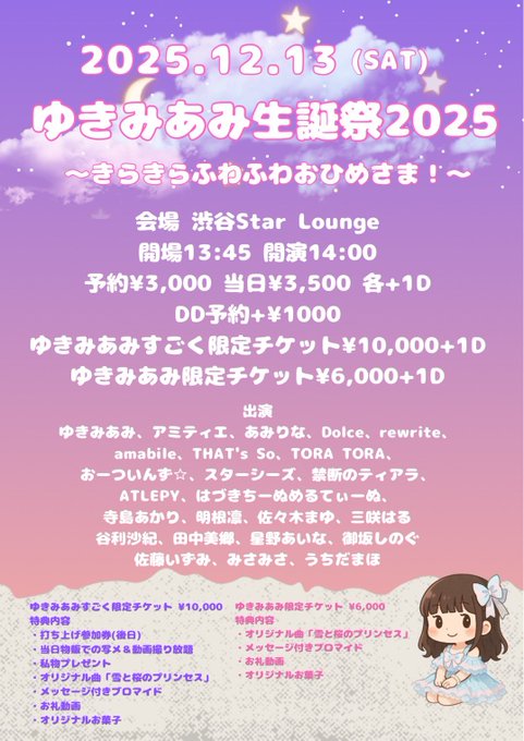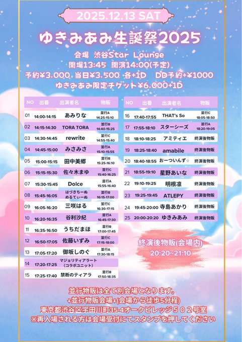 難波・日本橋 Cafe and Bar Ciel田中美郷🦄@tanakamisatoxX·12月13日ほんじちゅ‼️ きっとたくさんの人に会えると、信じてる 鬼楽しいタイテだから物販急ぎ協力し合おうねwww引用田中美郷🦄@tanakamisatoxX·12月5日返信先: @tanakamisatoxXさん\東京🗼遠征‼️/ 🤍12/13(土) 渋谷Star Lounge🤍 ゆきみあみ生誕祭2025 開場13:45 開演14:00 予約3000円 当日3500円 各1D代別 DD予約1組追加毎に+1000円 🎤15:00〜15:15 📸15:25〜16:10 別会場 物販B 🎁予約特典 メッセージ入りブロマイド ご予約はこちら https://tiget.net/events/4352223296