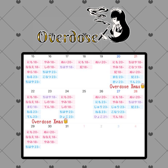 難波・日本橋 Overdose固定Overdose@SB_Overdos·12月後半のお給仕予定🌟 12/20~12/24はクリスマス衣装でお待ちしております🎄.* ※ピンク...バー帯、ブルー…ナイト帯、パープル…通し ⚠予定は予告なく変更になる場合がございます13125