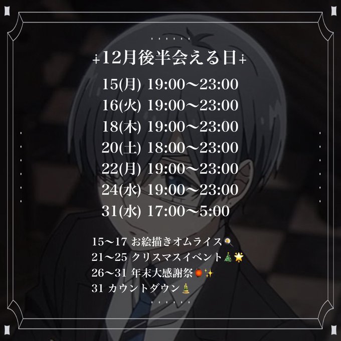 難波・日本橋 クロナイ固定ちの🍫@クロナイ@kuronai_chino·🖤✞12月後半召喚予定✟🖤 ・19日 (金) 18~23 ・20日 (土) 16~23 ・21日 (日) 16~23 ・24日 (水) 18~23 ・27日 (土) 16~23 ・29日 (月) 18~23 ・30日 (火) 18~23 今年も終わりに近づいて来ましたΣ( ˙꒳˙ )2025年ラスト召喚予定!何卒よろしくお願いします!8153