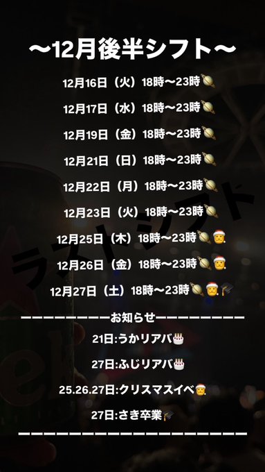 難波・日本橋 じゃぱにーずKAWAiiりりあ嬢さんがリポストさき💬@saki__PS·〜12月後半シフト〜 シフトだああああ!! 予定と変更は無しです!! ラストまで病気にならず駆けぬけます! よろしくお願いしますーーー!!!プラネットサルーン(公式)314447