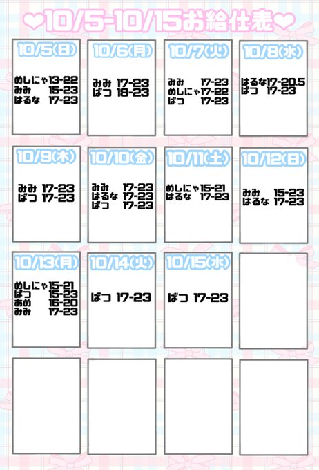 固定ぱるにゃんこ💘@haruna_catwalk·8時間8,10,11,12,(13)いまつ🙋♀️✨✨ 4連勤がんばるにゃーฅ^•ω•^ฅ 13日、私が入れば全員揃うので恐らくパーティ🥳🎉✨でち❕たのしみー🎵引用Cat walk【キャットウォーク】@Cat_walk91·10月4日🎀10/5-10/15お給仕予定のお知らせ🎀 ❤︎営業時間❤︎ 平日 17:00-23:00 土日祝 13:00-23:00 ※オープン、クローズはキャストの出勤時間に伴います ❤︎システム❤︎ ノンアルコース ¥1,000(税込)/1h アルコールコース¥1,500(税込)/1h ⬆️ご好評につき期間が伸びました🎉18337