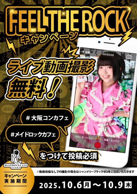 メイドロックカフェ大阪@mrc_osaka·10/6~10/9【✨FEEL THE ROCK!!キャンペーン🎸】 🎼.•*¨*•.¸¸♬•*¨*•.¸¸ ♬*.:* 期間中はライブ動画の撮影が無料に❗️ #大阪コンカフェ #メイドロックカフェ をつけて投稿してくださいね🎶 .•*¨*•.¸¸♬•*¨*•.¸¸ ♬*.:*.•* #MRC #MRC大阪1117