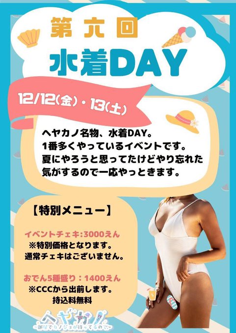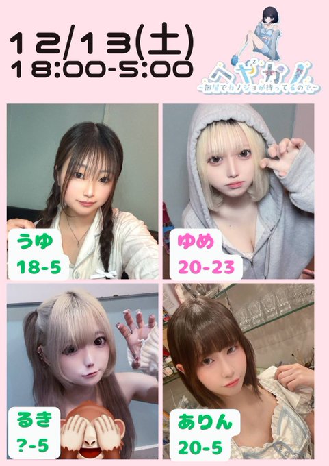 心斎橋・ 宗右衛門 ヘヤカノ- ヘヤでカノジョが待ってるので。-大阪心斎橋ミナミのコンカフェ「ヘヤカノ」@heyakano·♡12/13(土)本日会える彼女♡ うゆ18-5 @uyu_chan_n ゆめ 20-23 @Yumesan_q ありん 20-5 @arin6236 るき ?-5 @ruki_1018_0 ☆水着イベント2日目☆ 特別な彼女がお待ちしております♡ 好きぴのおかえりお待ちしてます(՞ . ̫ . ՞)3387
