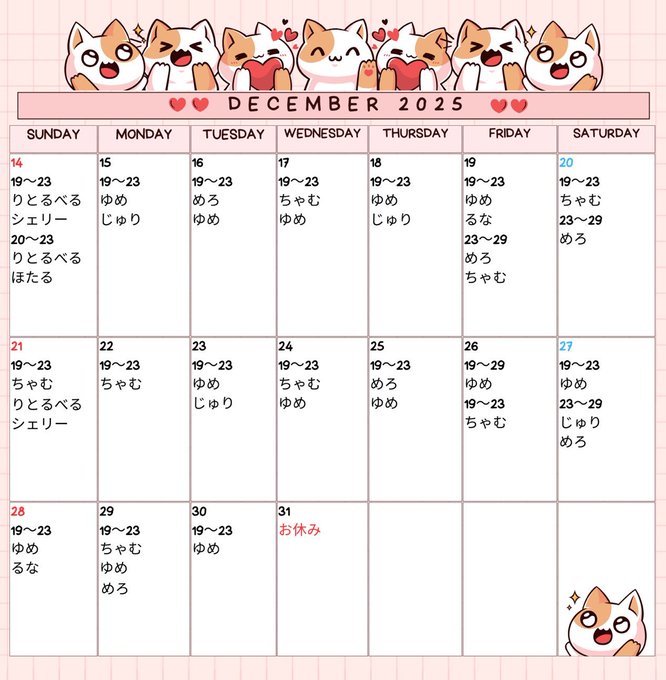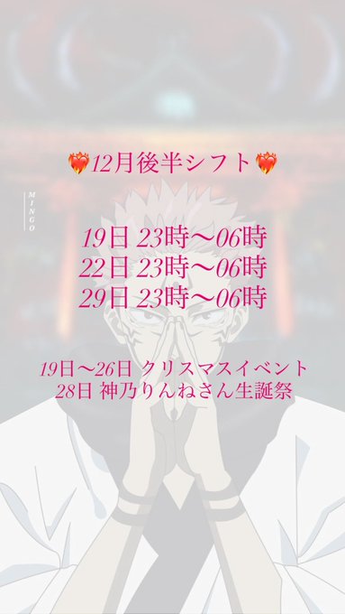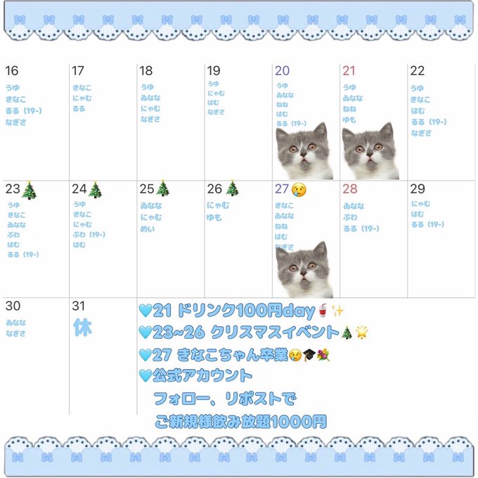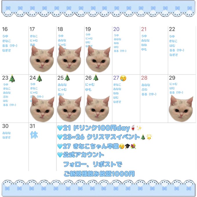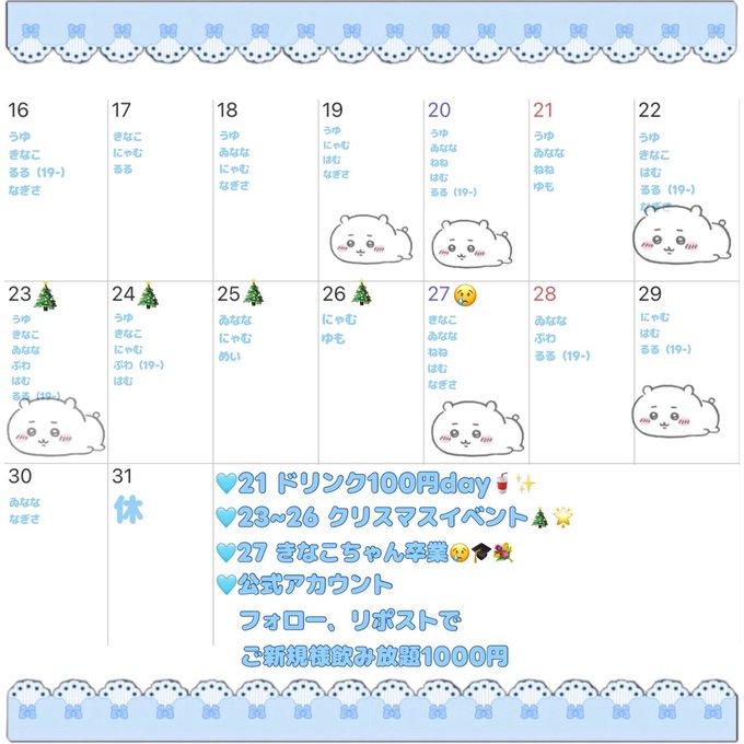 難波・日本橋 CoCo Chaton固定ゆめ@yumenimiru__·8時間中旬いないけどそれ以外いてます! 24~28 サンタコス🎅🏻🎀 29.30は私服ですෆ.*・゚ 31はりとるべるにいるので一緒に年越しできるとうれしいなーᐡ ̳ᴗ ̫ ᴗ ̳ᐡ 2025年残りもよろしくお願いします⸜❤︎⸝引用CoCo Chaton@CoCo_Chaton·12時間日頃よりご来店ありがとうございます。 12月後半のシフト表です! クリスマスイベント🎄 12月24日〜12月28日 私服イベント 12月29日〜12月30日 誠に勝手ながら31日は休業になります🙇♂️ よろしくお願いします🙇♂️7307