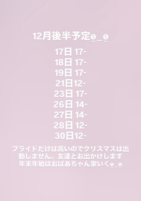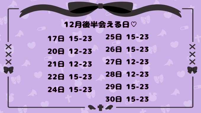 難波・日本橋 Overdose固定こなつฅ@tiaraki_ara·12月後半⛄️ 12/16 23:00-5:00 12/21 18:00-23:00 12/27 23:00-5:00 でいます♡予定出すのもこれで最後‼️‼️会いたいです‼️本当に‼️‼️ いつも通り楽しく一緒にいる時間を幸せな時間にしたいな1250