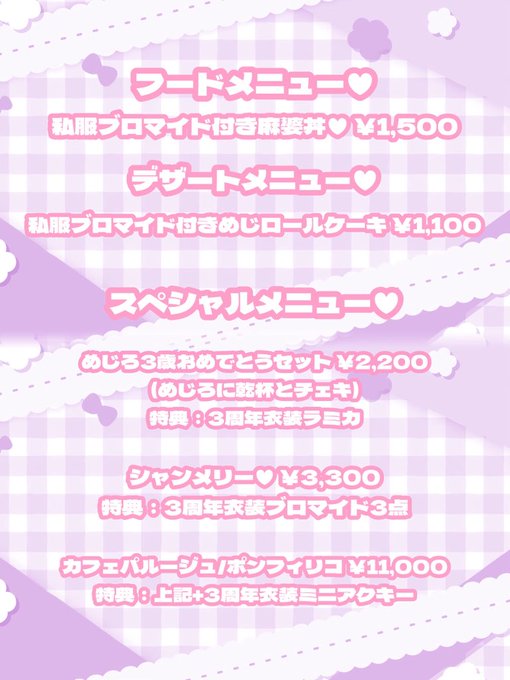 難波・日本橋 子猫maidcafeRagdollめじろ🍙1/313️⃣周年EV♡@Lum_mjr·5時間お待たせしました💕めじろ3周年のメニューです❕カフェパルージュ.ポンフィリコの特典に関しましては発注数をだいたい知っておきたいのであけたいよーって方は連絡下さると助かります🥲✨前祝い.後祝いの方も特典つけるのでぜひ当日来れない方も連絡ください👶🏻💗引用めじろ🍙1/313️⃣周年EV♡@Lum_mjr·5時間♥めじろ3周年メニュー♥5175