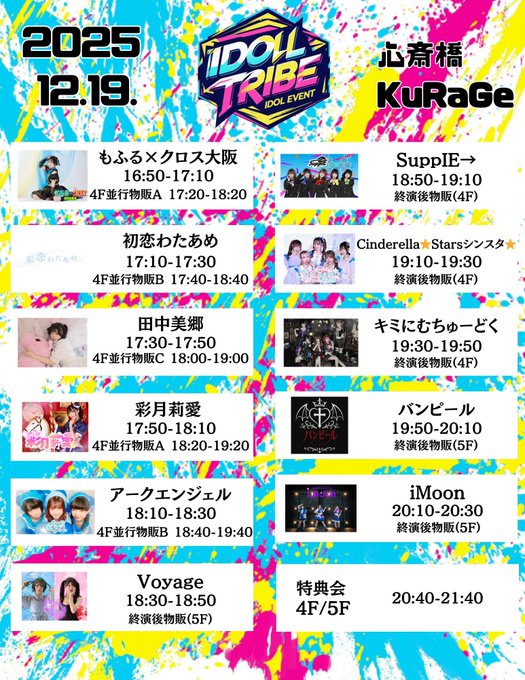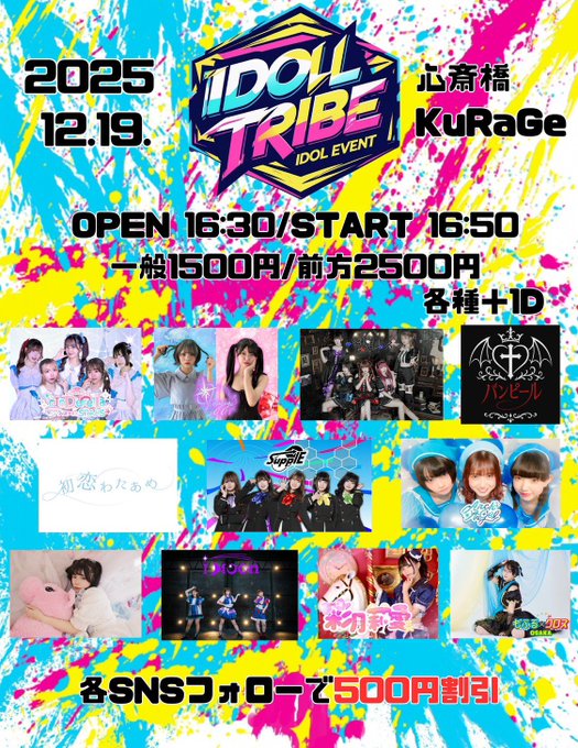 難波・日本橋 Cafe and Bar Ciel田中美郷🦄@tanakamisatoxX·13時間🤍12/19(金) 心斎橋KuRaGe🤍 IDOL TRIBE 開場16:00 開演16:30 予約1500円 前方2500円 各1D代600円別 公式YouTubeチャンネル登録&公式Xフォローでチケット代500円引 🎤17:30〜17:50 📸18:00〜19:00 🎁1ショット写メ https://x.com/idoltribe/status/1998347714958958881?s=46…引用IDOL TRIBE@IDOLTRIBE·12月9日アイドル対バンライブ 『IDOL TRIBE』 タイムテーブル公開! 【日時】 12月19日(金) OPNE 16:30/START 16:50 心斎橋KuRaGe 【チケット】 チケットはこちら🎫 https://tiget.net/events/449991 【TRIBE特典】 公式YouTubeチャンネルの登録とX(@IDOLTRIBE)のフォローで500円割引!18157