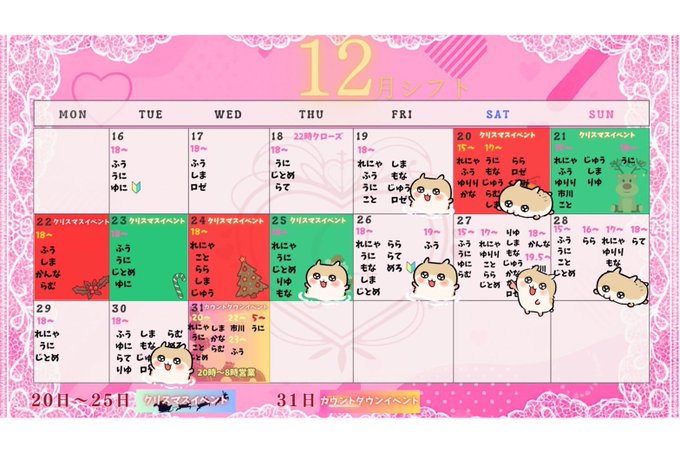 難波・日本橋 cafe &barアンジェール固定もな🐰@angelle@mona_angelle·12月後半シフト✩⋆* 後半たくさんいます🤍クリスマス当日も!イベントもあるので会いにきてくれるとうれしい♪2025年最後いっぱいいっぱいがんばりますᐢ ̫ ᐢ♥ 20-25日 クリスマスイベント 31日 カウントダウンイベント13116