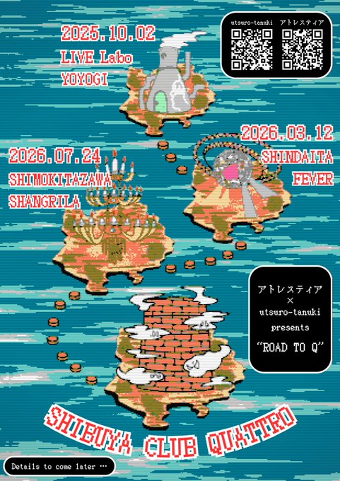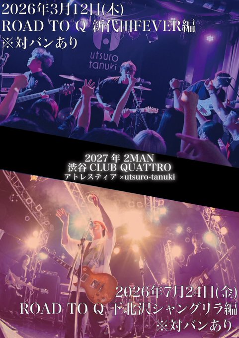 にゅん🪐10月末で店がサ終👈はい❓@Nyun2shisha_plb·4時間はぁ~~楽しみすぎ!全部いきたい!引用utsuro-tanuki@utsuro_tanuki·23時間【 重大発表① 】 アトレスティア × utsuro-tanuki presents. “ 2MAN LIVE at 渋谷CLUB QUATTRO “ 本日の『ROAD TO Q』で発表した通り、2027年 渋谷CLUB QUATTROにてアトレスティア(@ALR_band)と対バンします。 それに伴い、ROAD TO Q 「新代田FEVER編」、「下北沢シャングリラ編」の開催も決定!14358