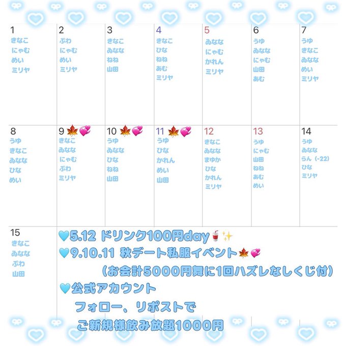 固定こゆ@パルファン大阪@PANIER_koyu·10月前半お給仕予定🗓🎃⭐️ 4日 ちょまさんハーフアニバです!!︎|◜𖥦◝ //)💕 9月ほとんどいなかったから10月はがんばるぞー‼️のきもち‼️10月もたくさん素敵な出会いがありますように♩来店予約などなどお待ちしております♩♩4128