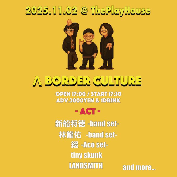 にゅん🪐大阪日本橋コンカフェぷらぼ@Nyun2shisha_plb·1時間お祝いだー‼️‼️‼️楽しみー‼️‼️‼️ 三人を絶対に潰しましょう‼️‼️‼️‼️引用マツムラタダトシ@mzmr_·13時間2025.11.02(sat.)@町田ThePlayHouse マツムラ×たつま×ルンバ pre. 【Λ BORDER CULTURE】 OPEN 17:00 / START 17:30 ADV.¥3000 & 1DRINK - ACT - 新船将徳 -band set- 林龍佑-band set- 綴 -Aco. set- tiny skunk LANDSMITH and more.... アレです。 11月勢のセルフ生誕祭です。 祝ってください。2148